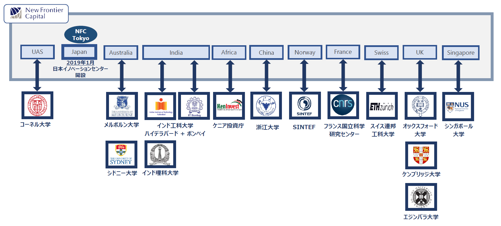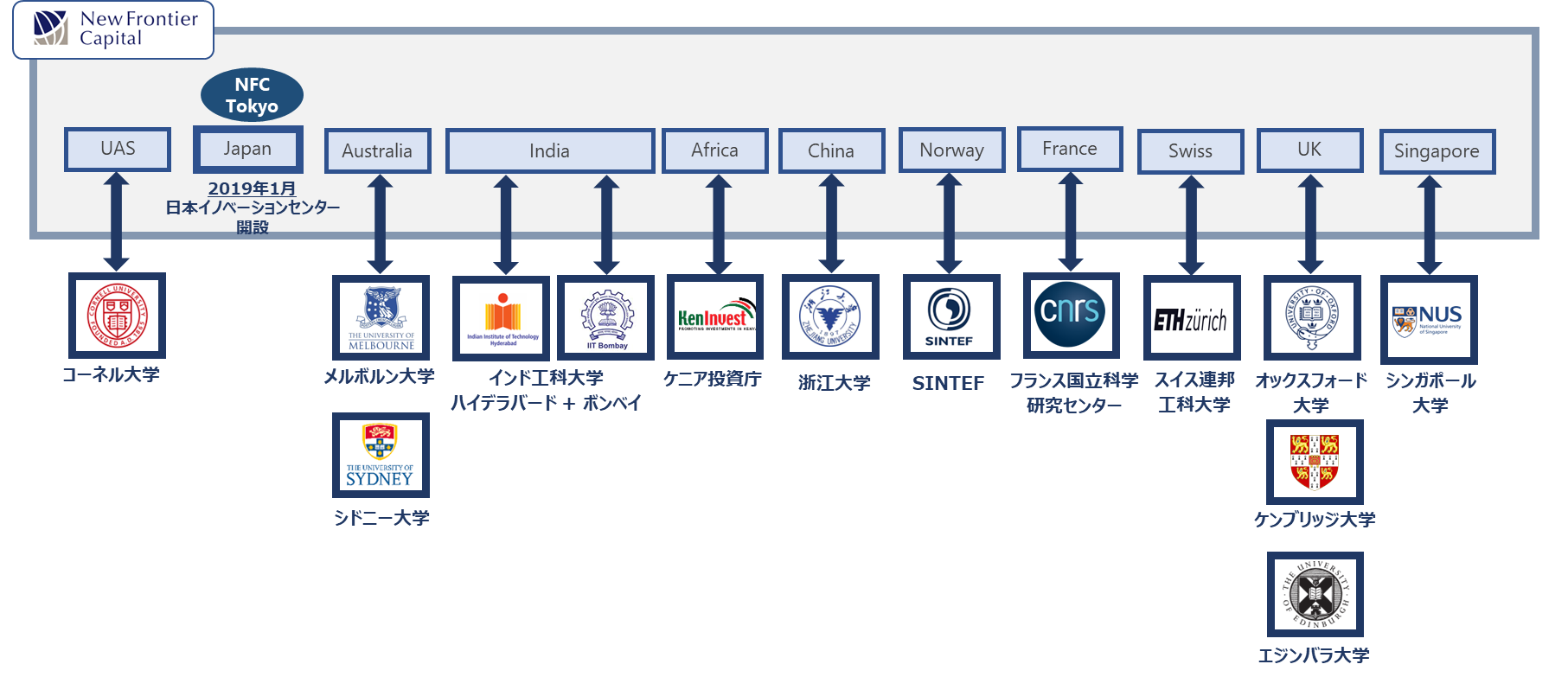 各国の有力な研究機関である大学等との連携を通 して、 グローバルな最先端技術に係わるイノベーションのエコシステムを 構築しています